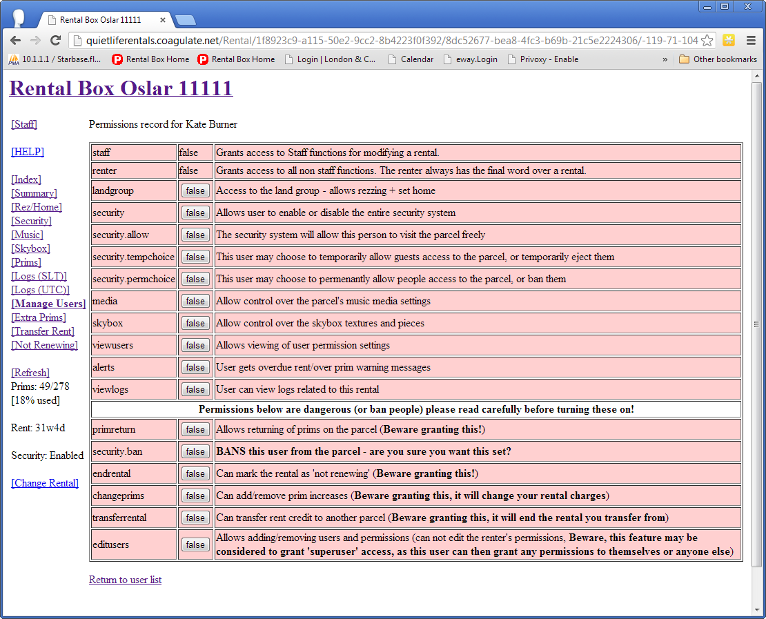 On the “Manage Users” page you will see a list of users the rental box knows about, this will include 2 staff members and the main renter, along with anyone who has been added to the security allow or ban lists (both of these are 'permissions', odd tho that may seem for a 'ban').