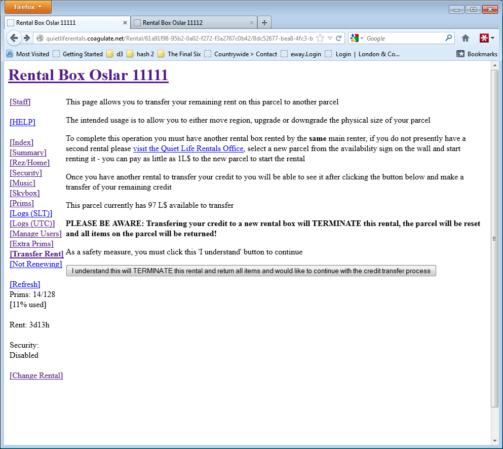 All of the features of the rental box and rental can be controlled by left clicking on the rental box, a “Open this webpage?” dialog will appear in second life and you may open the web page in either the in-world browser or your usual external browser (e.g. Internet Explorer, Firefox, Opera, etc). You may even bookmark the URL supplied and it will remain valid until the renter changes, meaning you can administer your rental without even being logged in to Second Life!